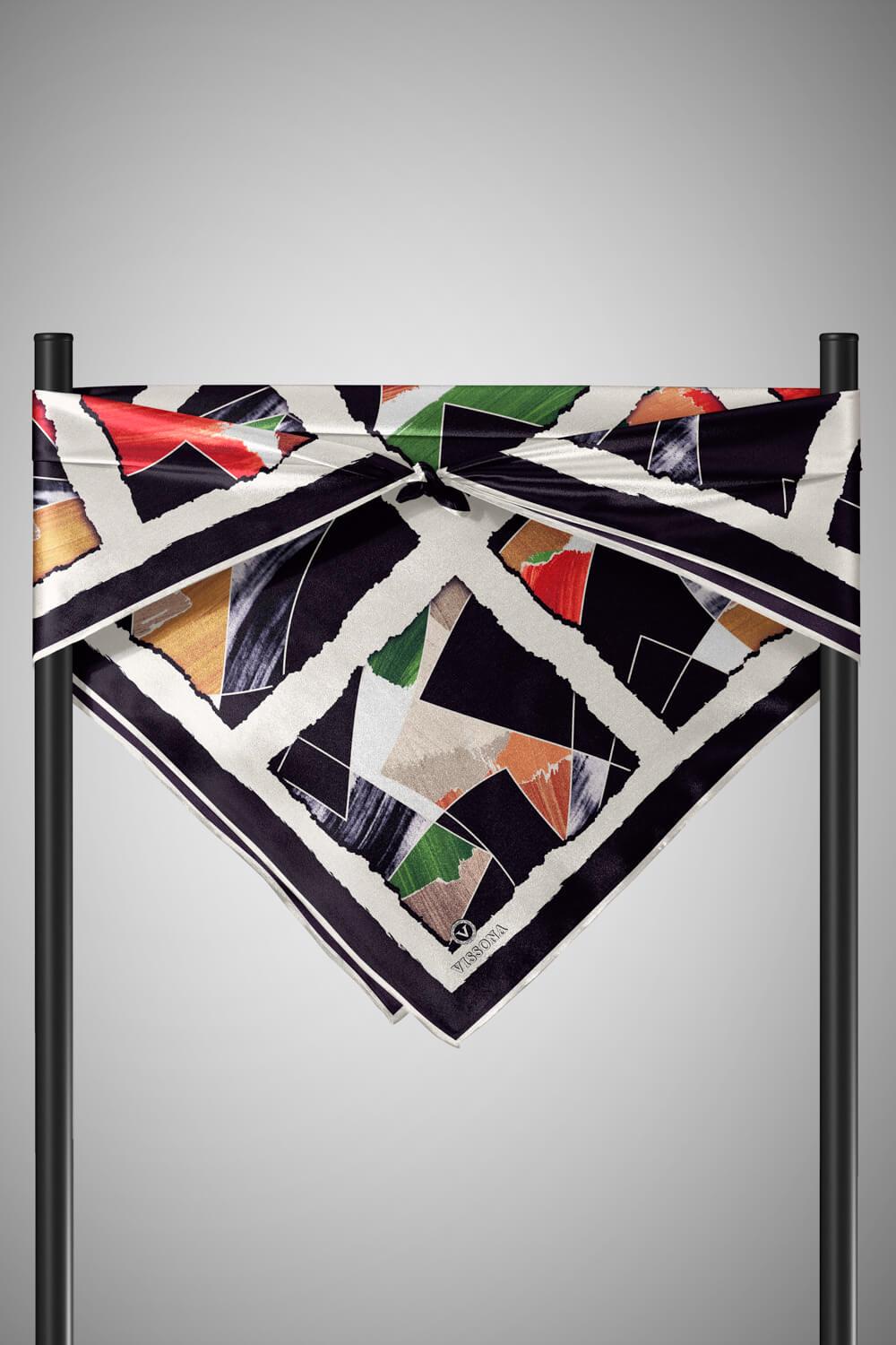%100 Twill İpek Geometrik Desenli Turuncu - Zümrüt Yeşili Renkli 90x90 Eşarp Dikim Şekli : El Dikişi