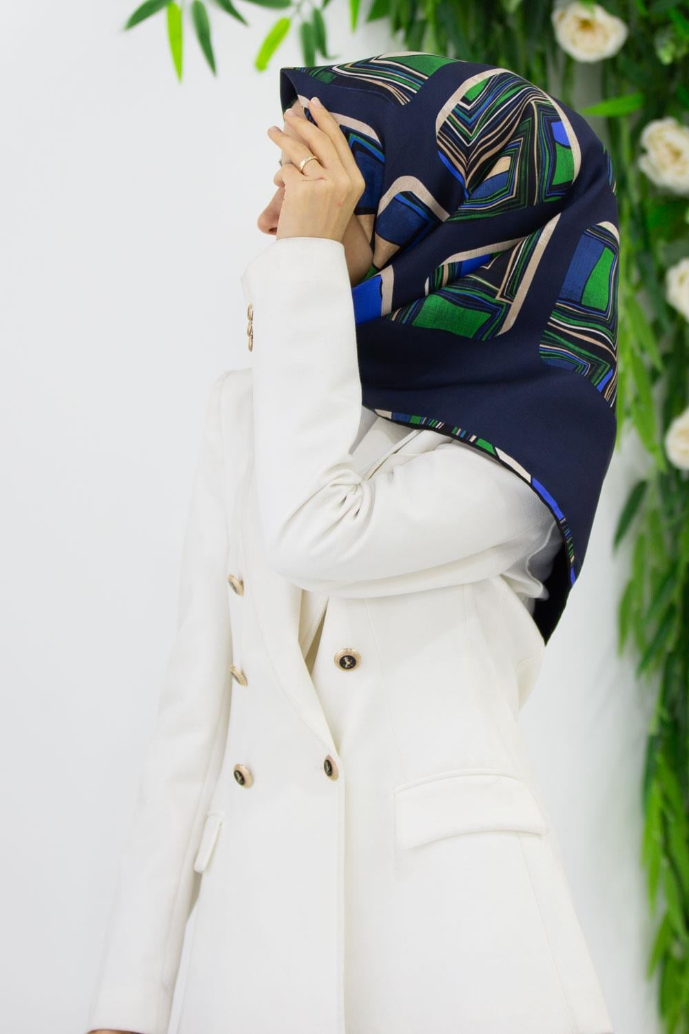 %100 Twill İpek Geometrik Kare Desenli Lacivert - Zümrüt Yeşili Renkli 90x90 Eşarp Dikim Şekli : El Dikişi