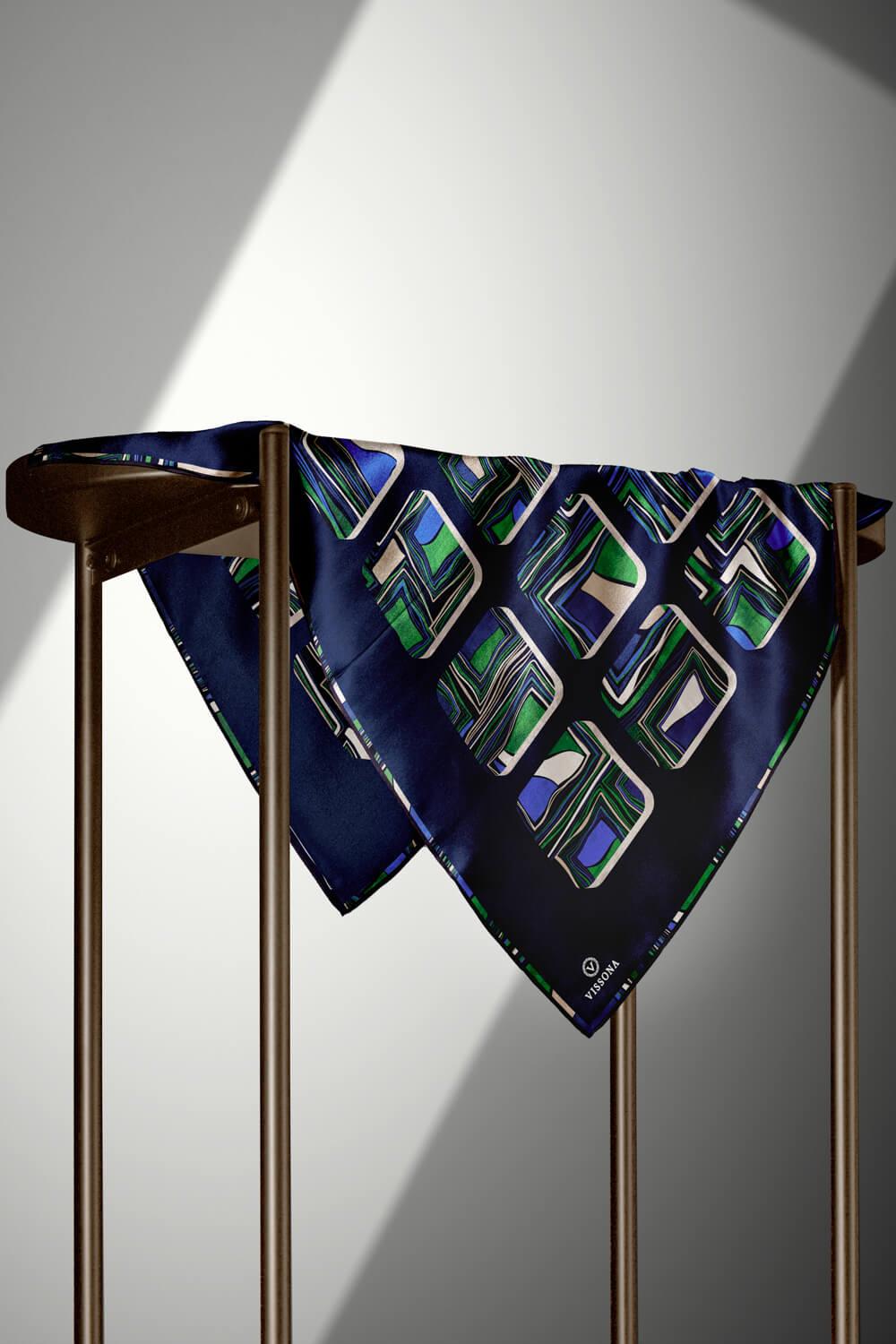 %100 Twill İpek Geometrik Kare Desenli Lacivert - Zümrüt Yeşili Renkli 90x90 Eşarp Dikim Şekli : El Dikişi (51967-8)