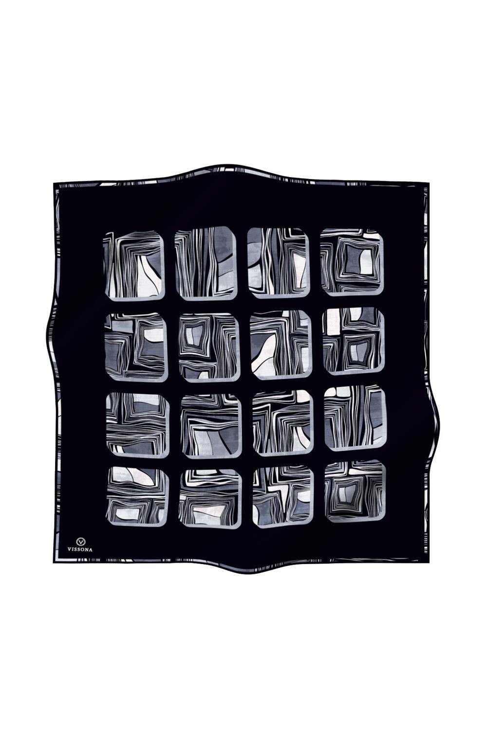 %100 Twill İpek Geometrik Kare Desenli Siyah - Beyaz Renkli 90x90 Eşarp Dikim Şekli : El Dikişi (51967-1)