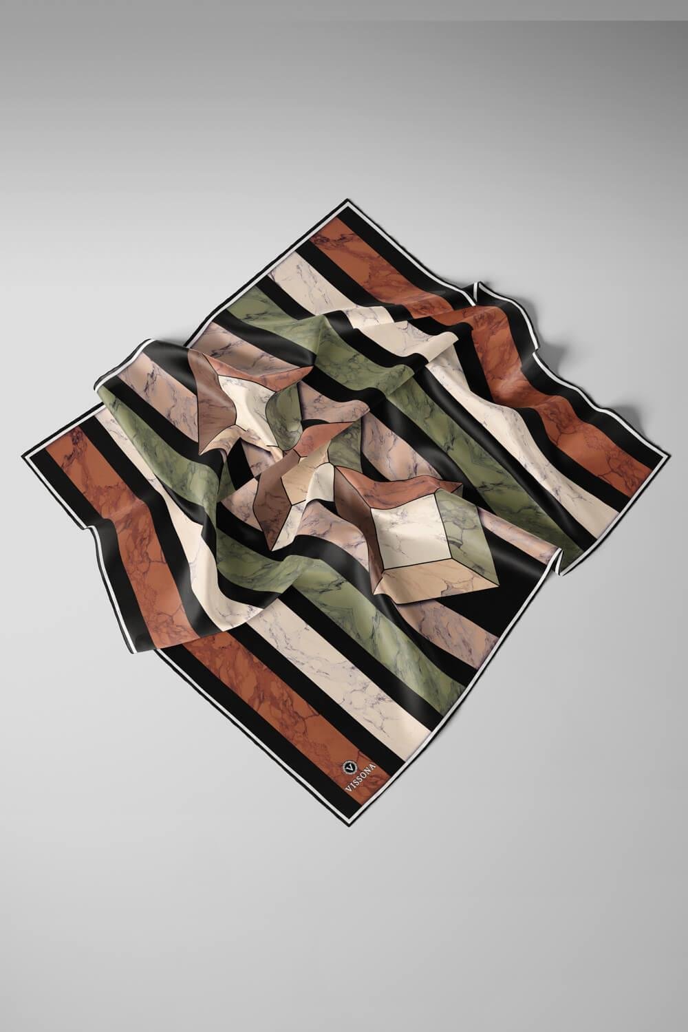 %100 Twill İpek Geometrik Mermer Desenli Haki - Bakır Renkli 90x90 Eşarp Dikim Şekli : El Dikişi