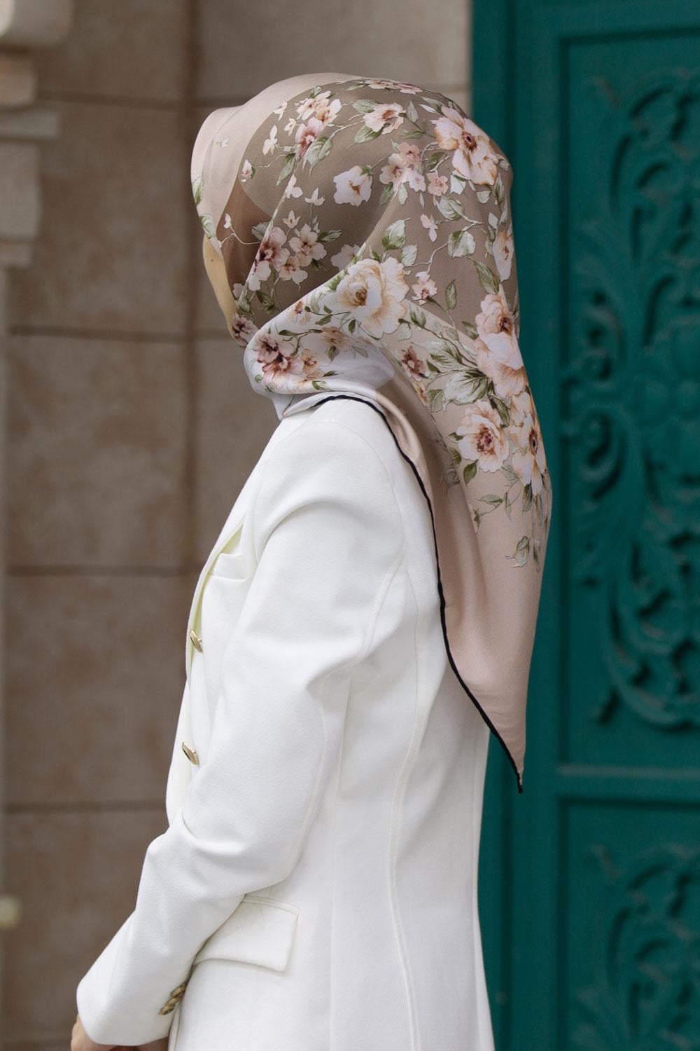 %100 Twill İpek Geometrik Ve Çiçek Desenli Bej - Taba Renkli 90x90 Eşarp Dikim Şekli : El Dikişi