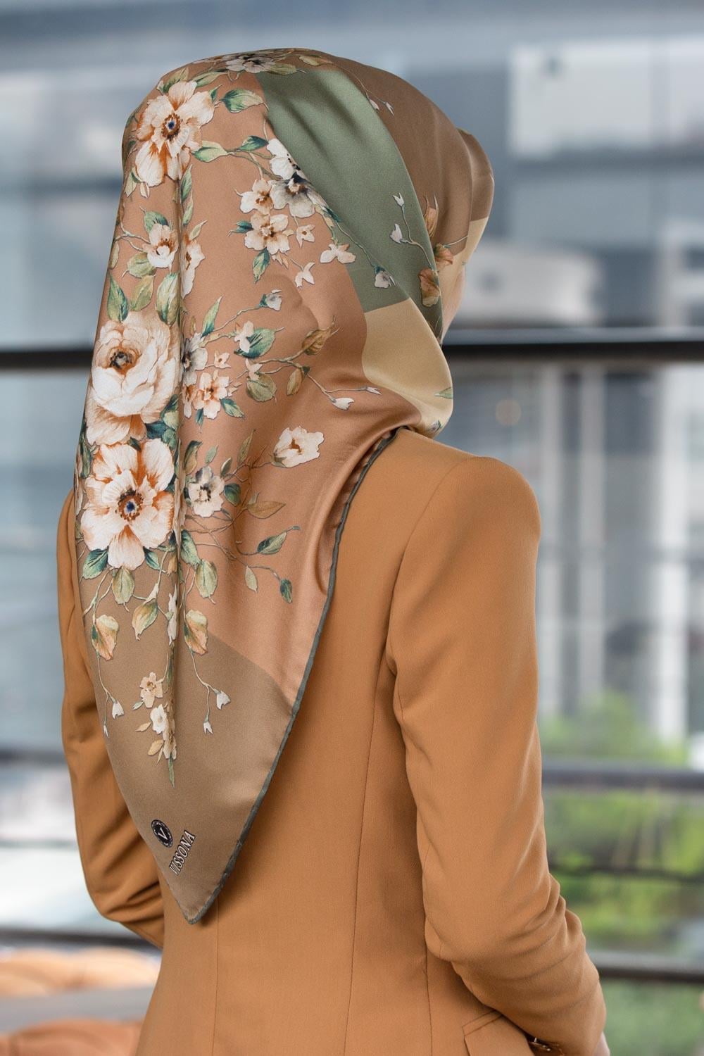 %100 Twill İpek Geometrik Ve Çiçek Desenli Haki Renkli 90x90 Eşarp Dikim Şekli : El Dikişi