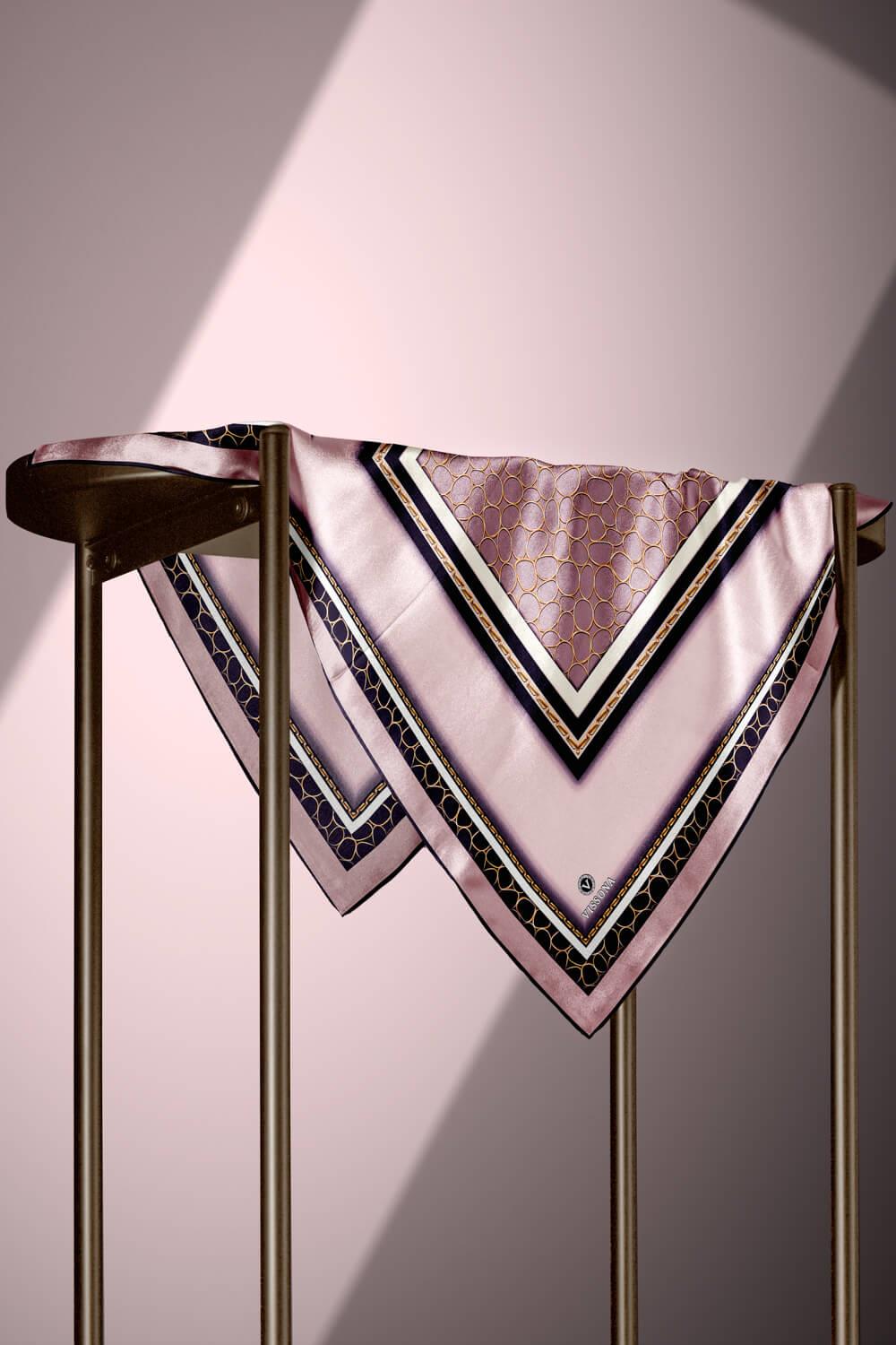 %100 Twill İpek Gold Halka Desenli Pudra - Siyah Renkli 90x90 Eşarp Dikim Şekli : El Dikişi (17147-6)