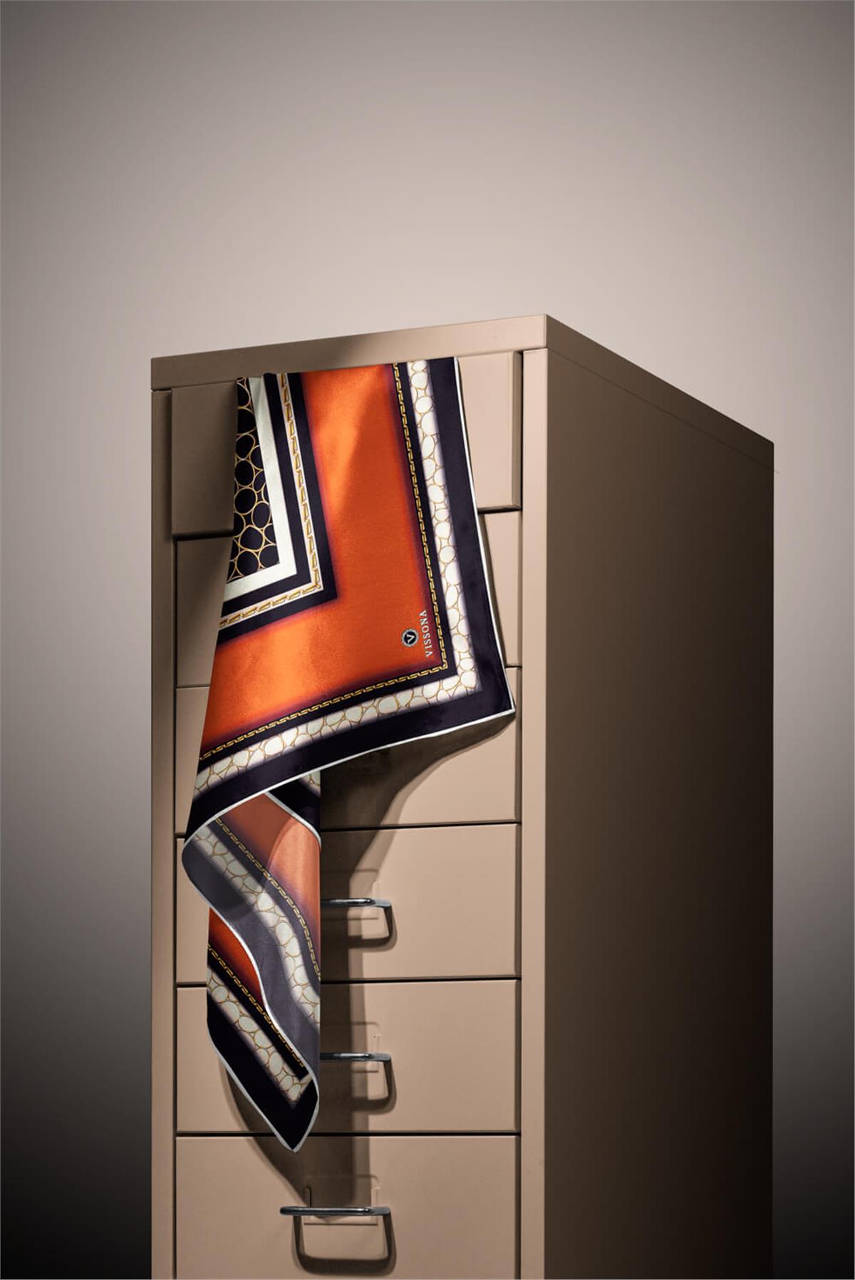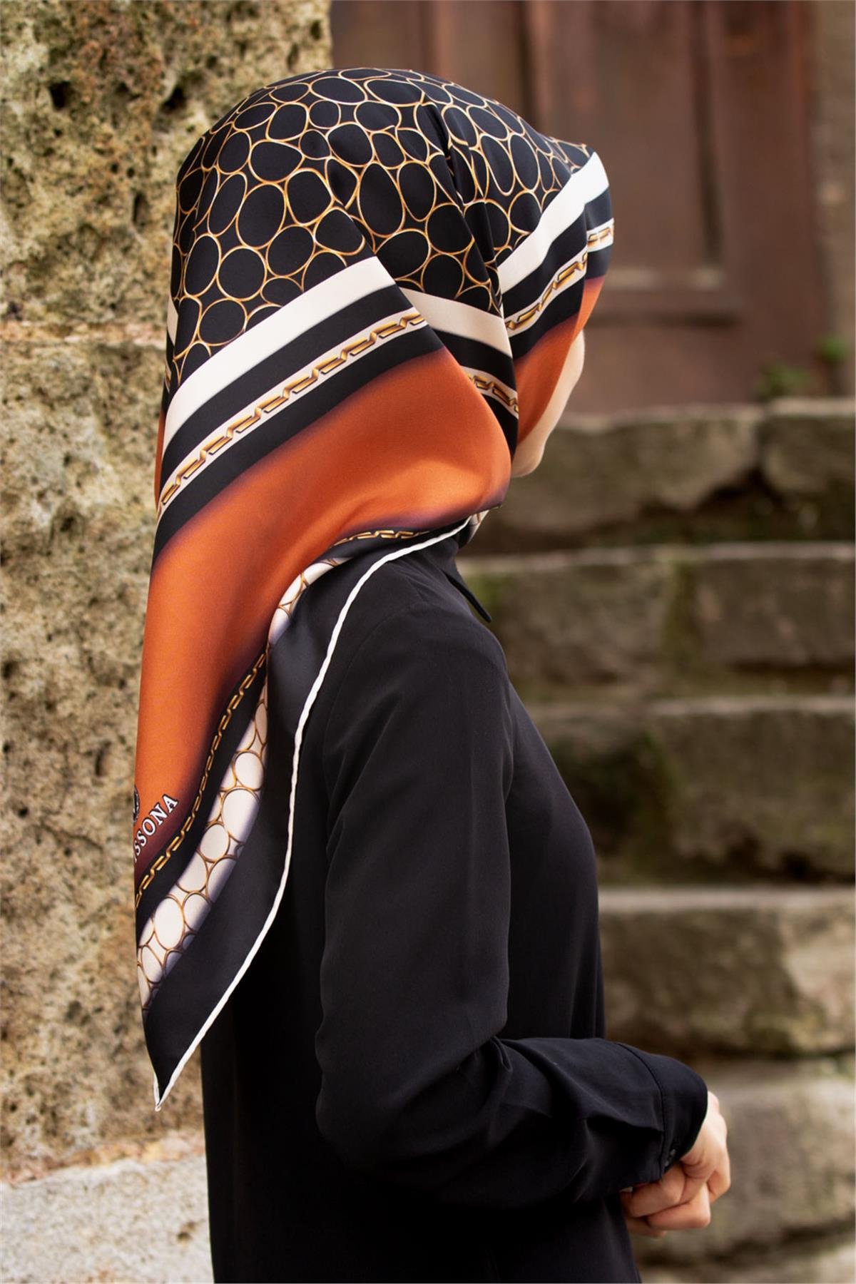 %100 Twill İpek Gold Halka Desenli Taba - Siyah Renkli 90x90 Eşarp Dikim Şekli : El Dikişi