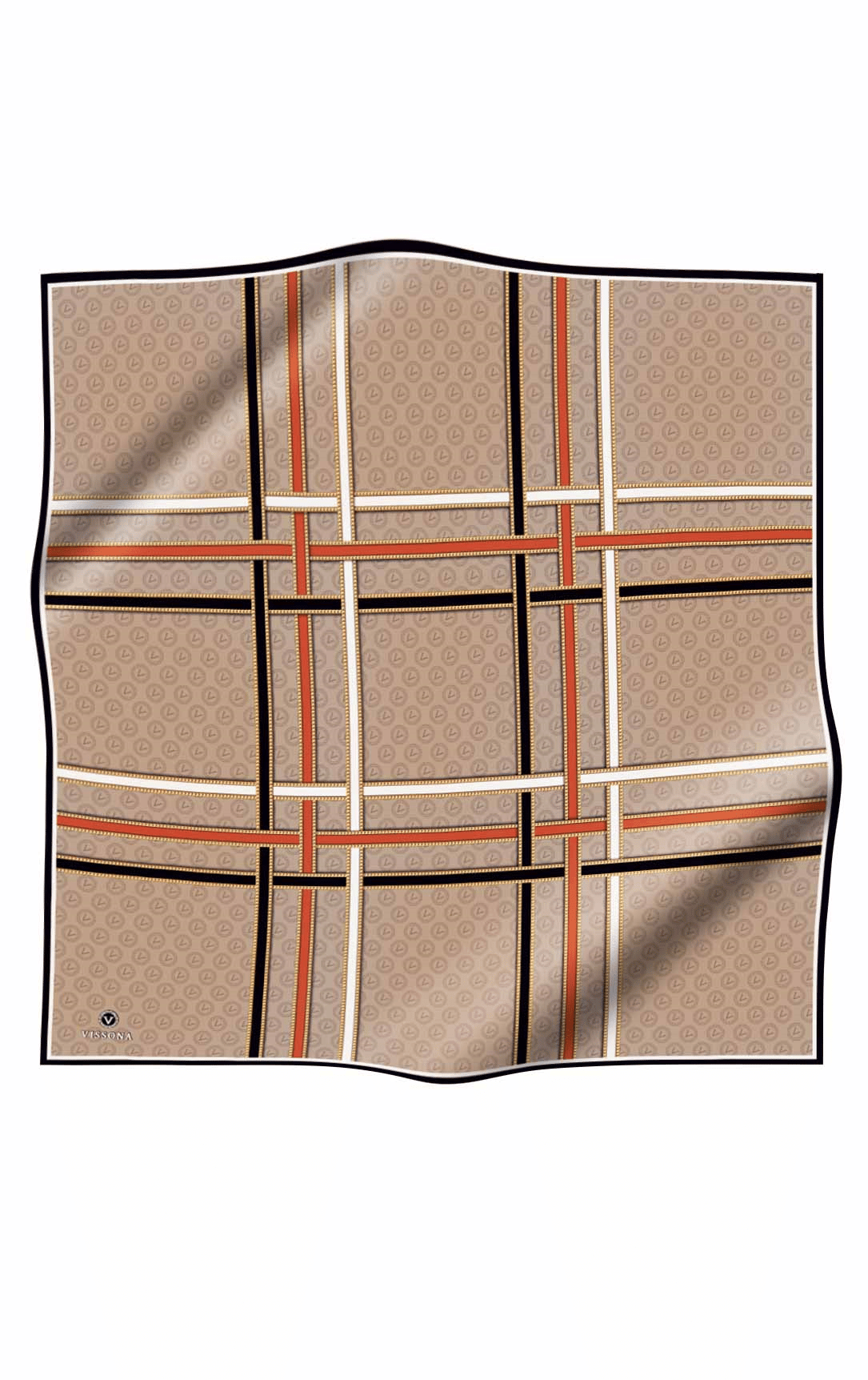 %100 Twill İpek Gold Şeritli Monogram Desenli Bej - Taba Renkli 90x90 Eşarp Dikim Şekli : El Dikişi (10626-7)