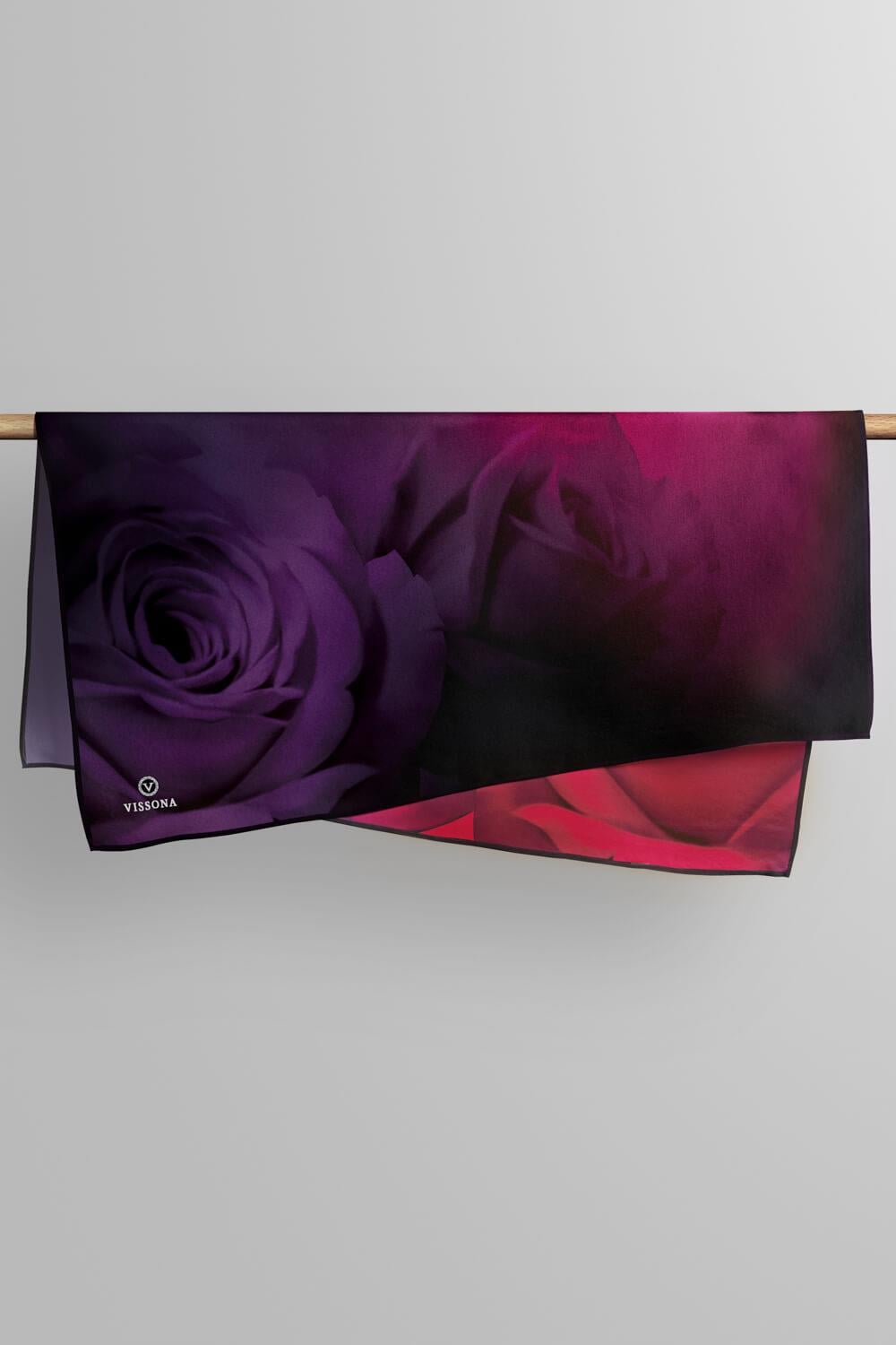 %100 Twill İpek Gül Desenli Kırmızı - Lacivert Renkli 90x90 Eşarp Dikim Şekli : El Dikişi (14292-5)