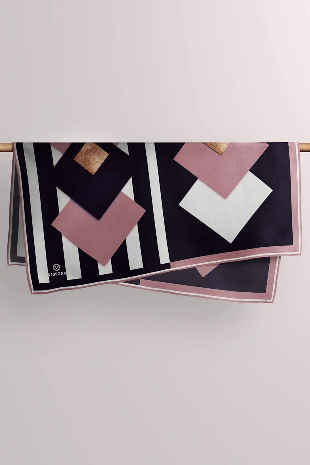 %100 Twill İpek Karo Desenli Pudra - Siyah Renkli 90x90 Eşarp Dikim Şekli : El Dikişi