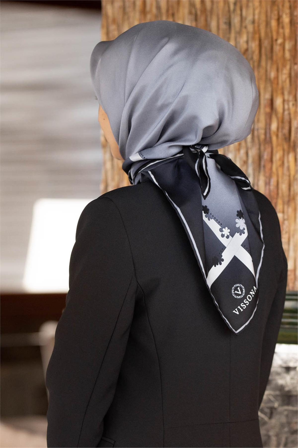 %100 Twill İpek Kenar Motifi Çiçek Desenli Gri - Gümüş Renkli 90x90 Eşarp Dikim Şekli : El Dikişi