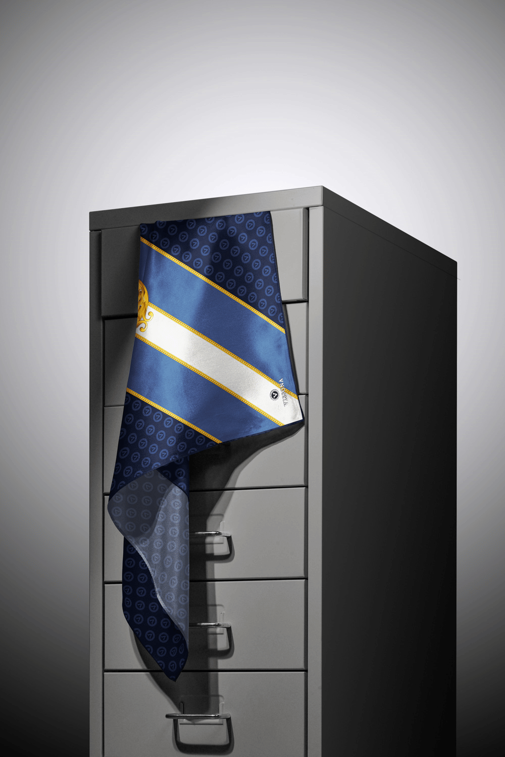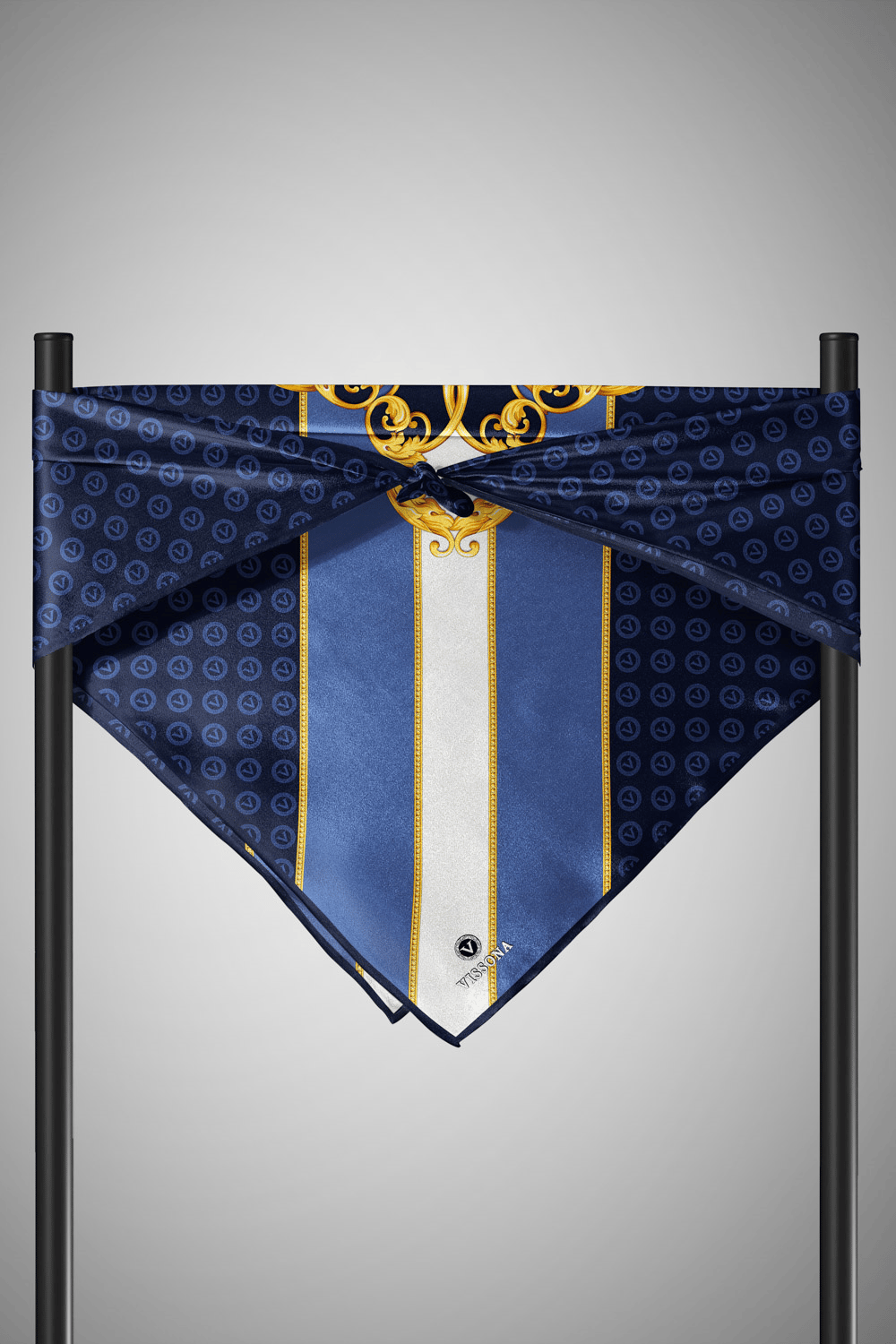 %100 Twill İpek Monogram Ve Barok Desenli Lacivert - İndigo  Renkli 90x90 Eşarp Dikim Şekli : El Dikişi