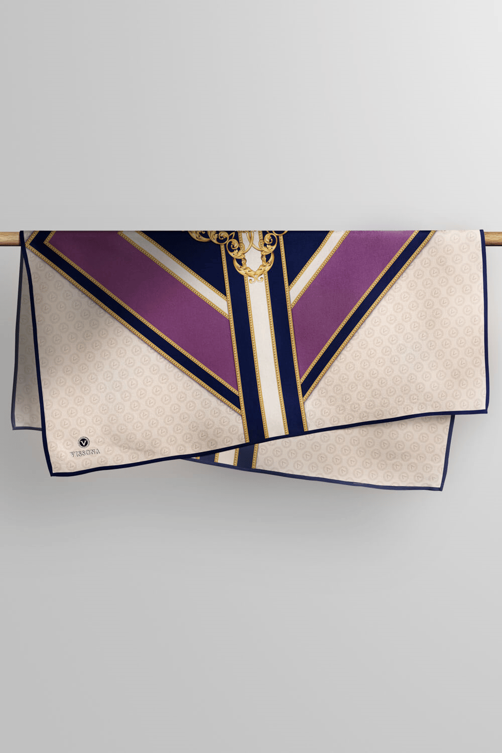 %100 Twill İpek Monogram ve Barok Desenli Lila - Lacivert Renkli 90x90 Eşarp Dikim Şekli : El Dikişi