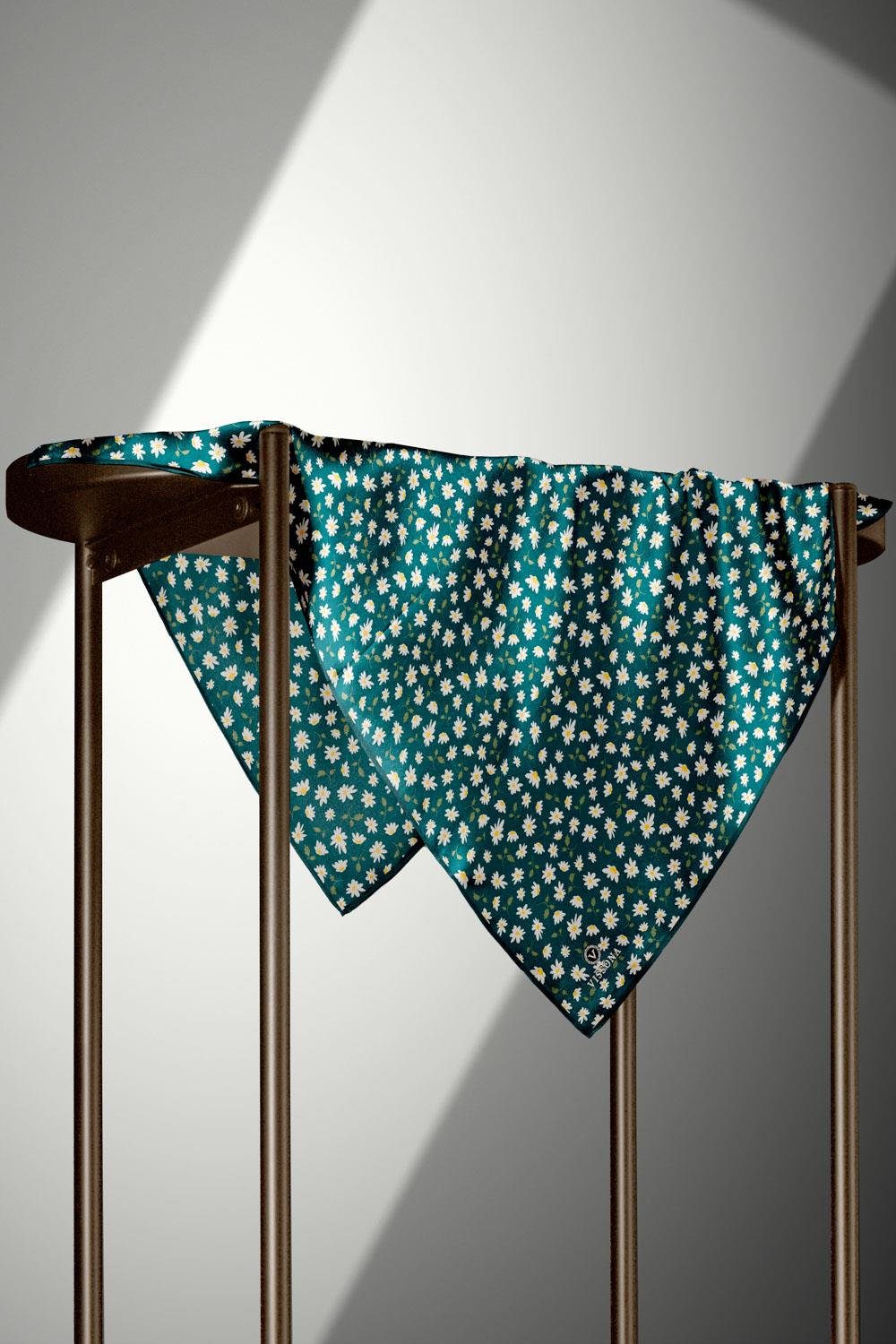 %100 Twill İpek Papatya Desenli Petrol Mavisi Renkli 90x90 Eşarp Dikim Şekli : El Dikişi