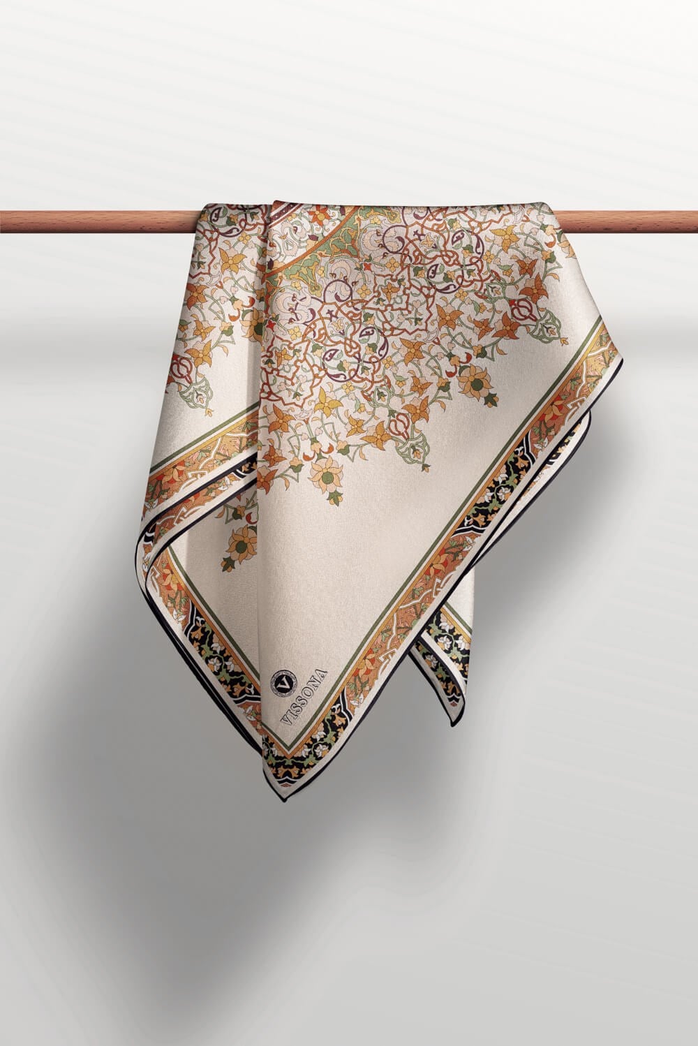 %100 Twill İpek Şal Desenli Bakır Renkli 90x90 Eşarp Dikim Şekli : El Dikişi