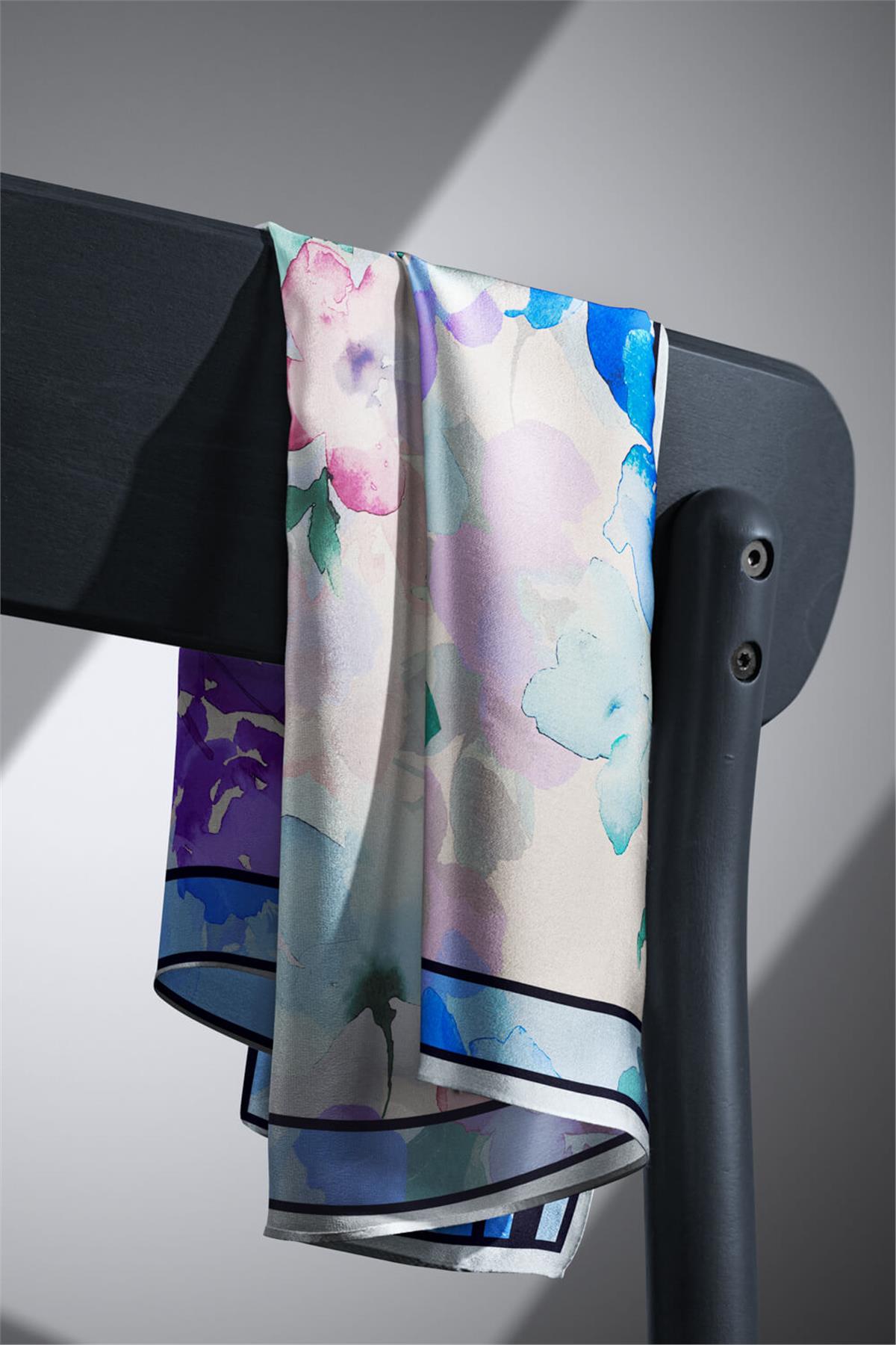 %100 Twill İpek Sulu Boyalı Çiçek Desenli Bebe Mavisi - Pembe Renkli 90x90 Eşarp Dikim Şekli : El Dikişi