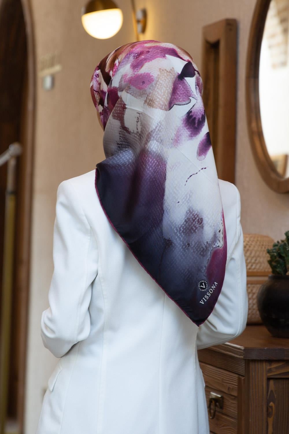 %100 Twill İpek Suluboya Çiçek Desenli Gül Kurusu Renkli 90x90 Eşarp Dikim Şekli : El Dikişi (61019-11)
