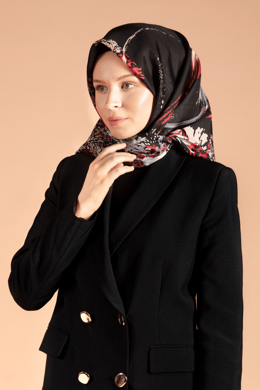 %100 Twill İpek Suluboya Çiçek Desenli Siyah - Bordo Renkli 90x90 Eşarp Dikim Şekli : El Dikişi