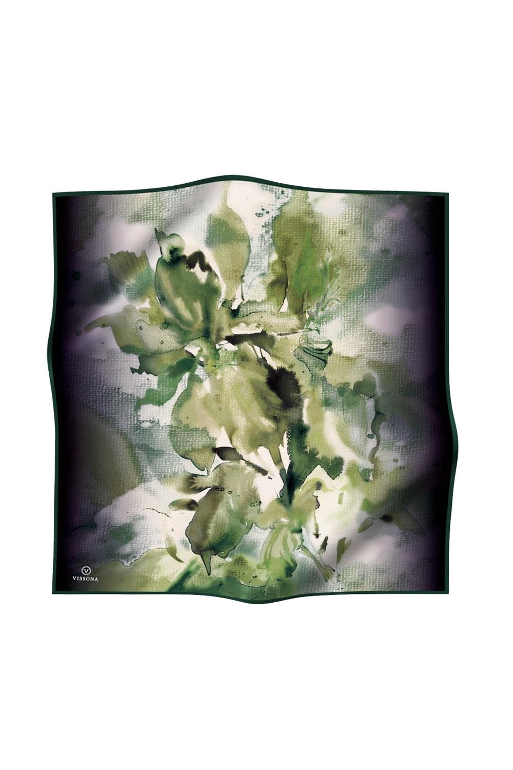 %100 Twill İpek Suluboya Çiçek Desenli Zümrüt Yeşili - Haki Yeşili Renkli 90x90 Eşarp Dikim Şekli : El Dikişi (61019-16)