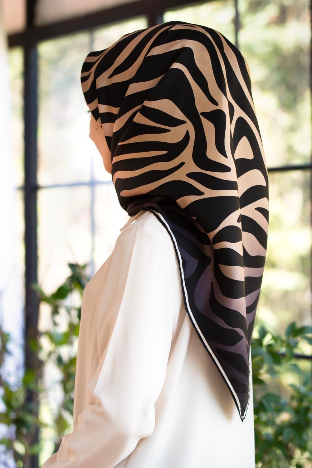 %100 Twill İpek Zebra Desenli Bej - Siyah Renkli 90x90 Eşarp Dikim Şekli : El Dikişi (6259-2)