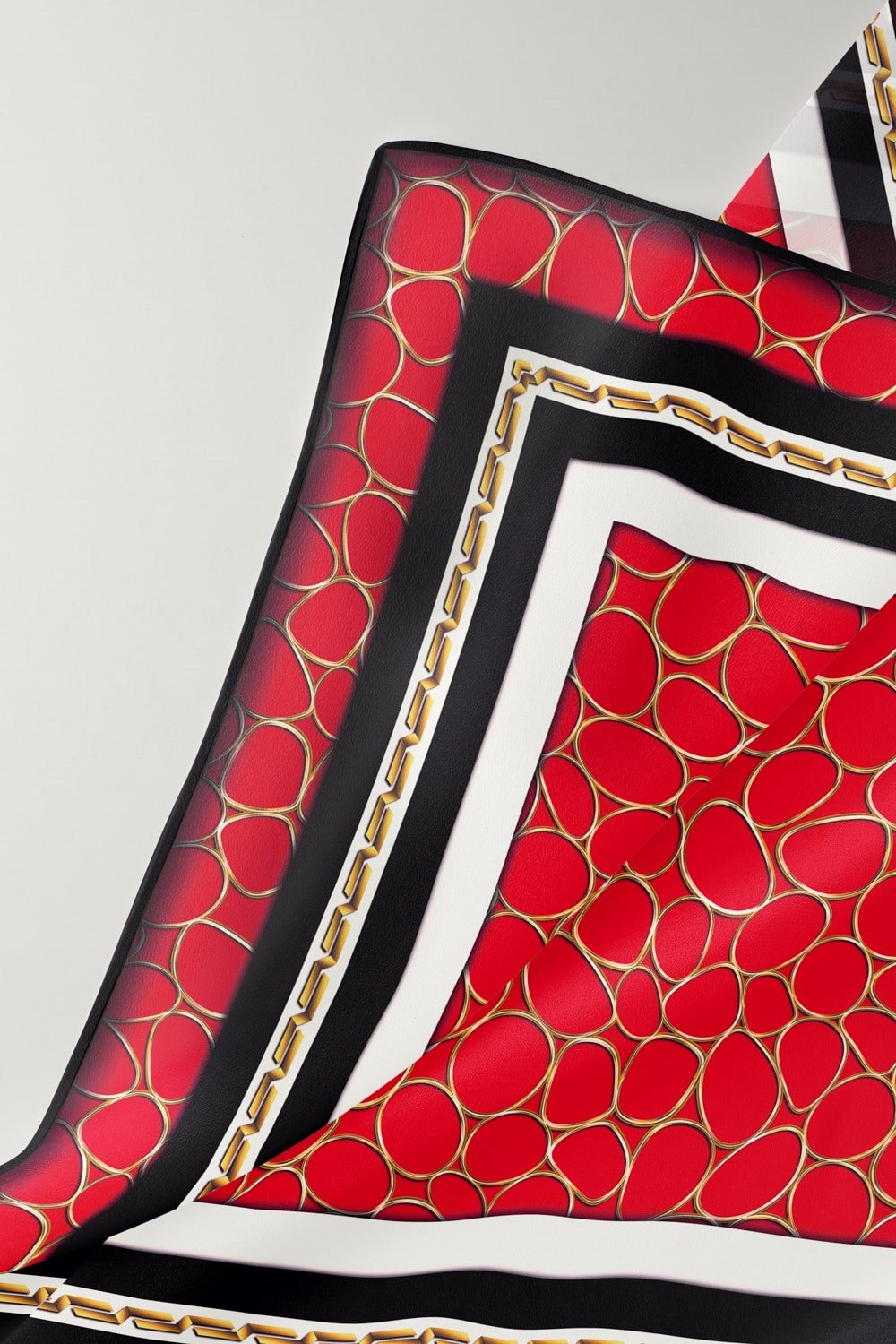 %100 Twill İpek Zincir Desenli Kırmızı - Siyah Renkli 90x90 Eşarp Kenar Dikiş Şekli El Dikişli