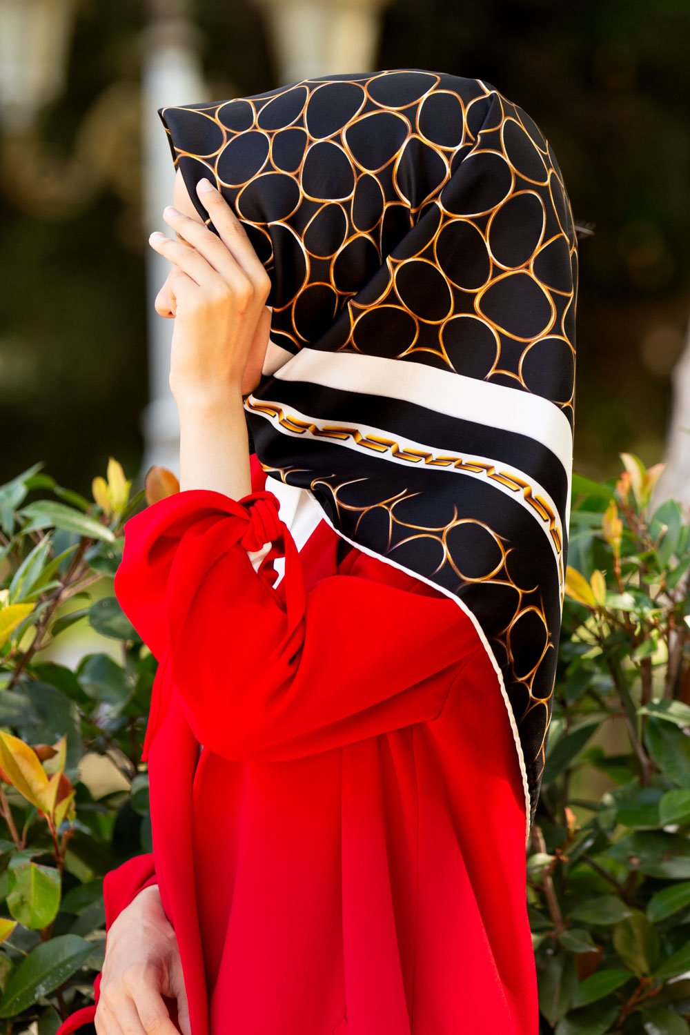 %100 Twill İpek Zincir Desenli Siyah - Krem Renkli 90x90 Eşarp Kenar Dikiş Şekli El Dikişli
