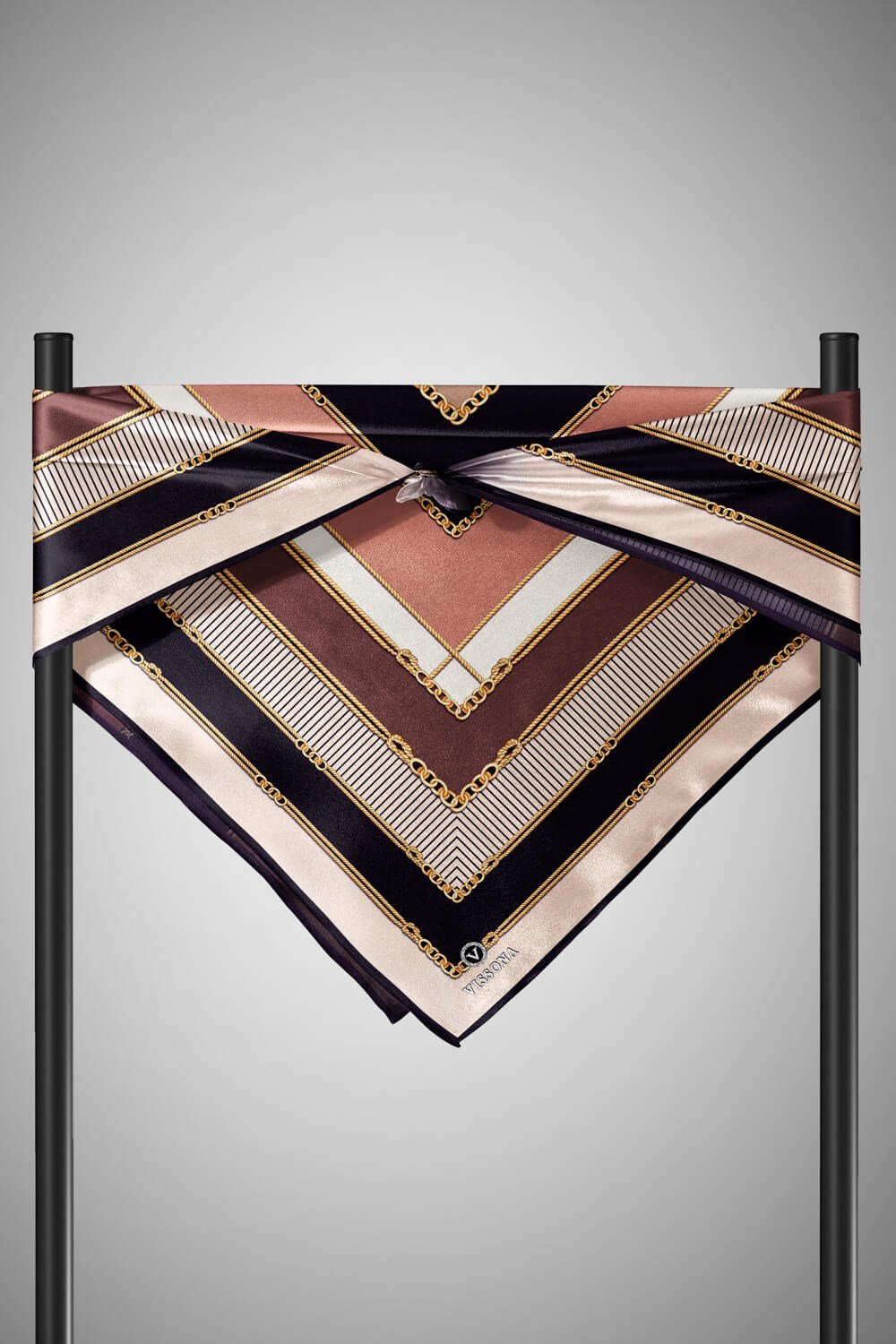 %100 Twill İpek Zincir Detaylı Geometrik Desenli Bej - Vizon Renkli 90x90 Eşarp Dikim Şekli : El Dikişi (17217-3)