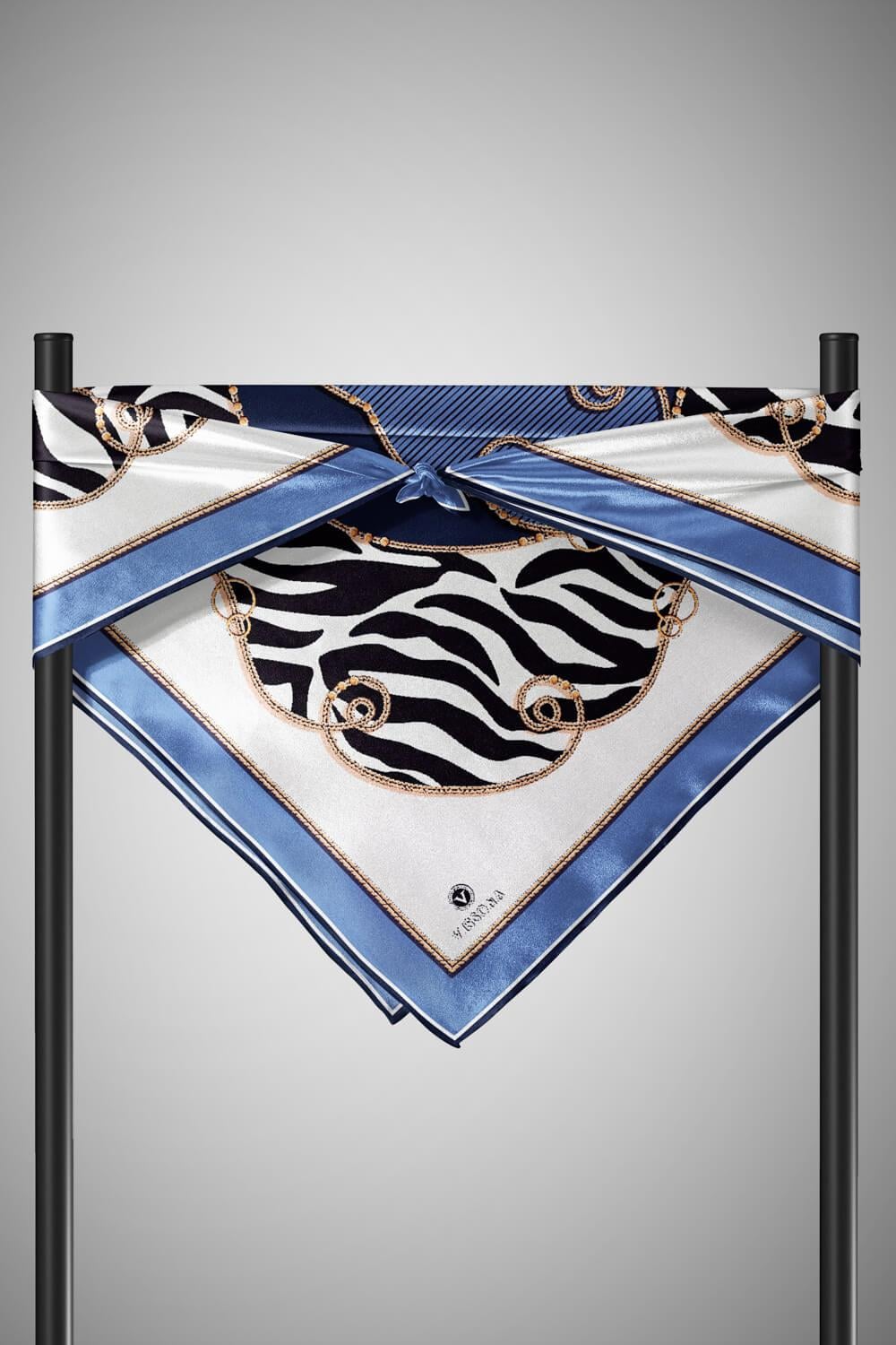 %100 Twill İpek Zincirli Ve Zebra Desenli Bebe Mavisi - Lacivert Renkli 90x90 Eşarp Dikim Şekli : El Dikişi