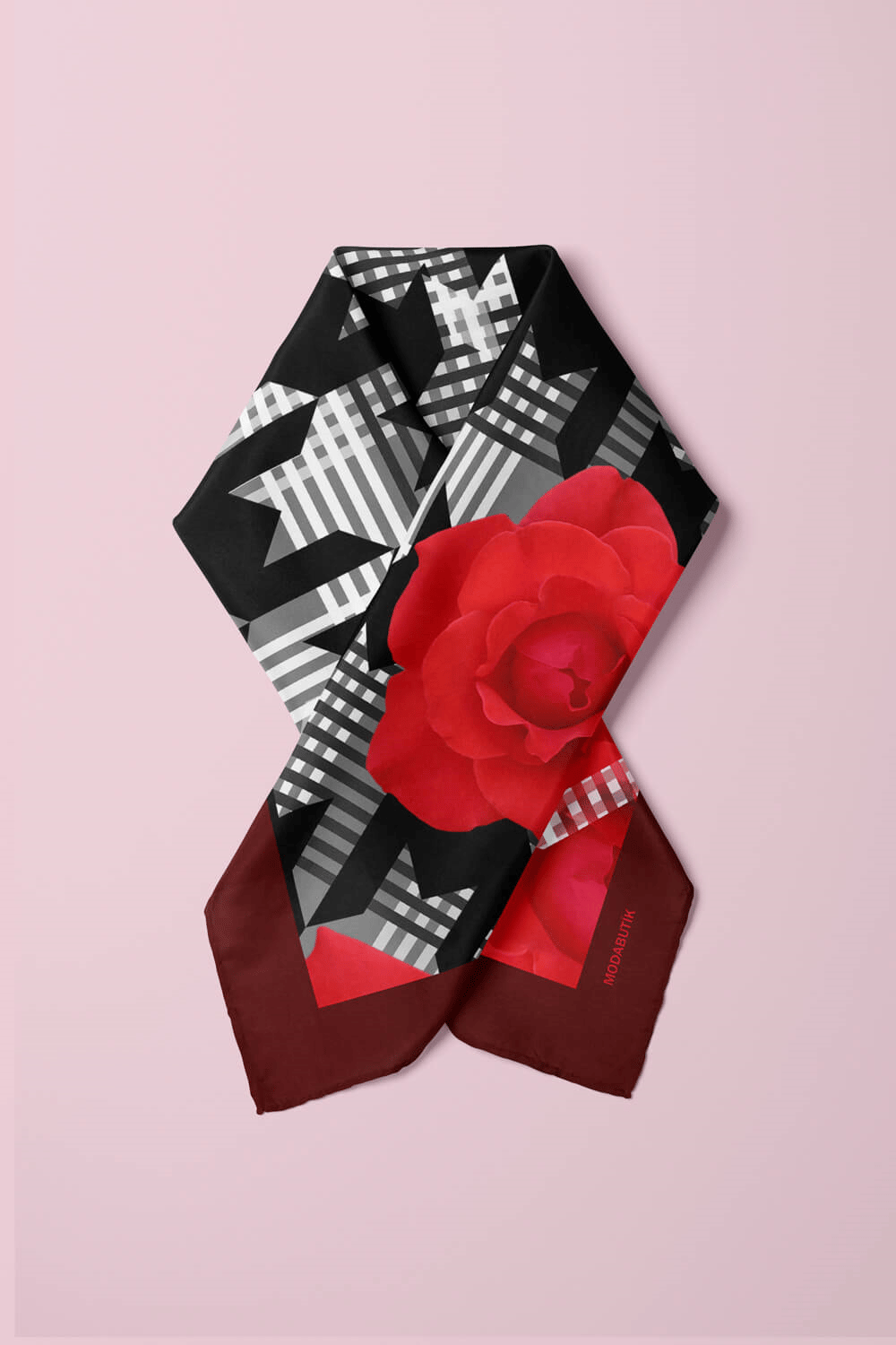 V19 Kadın Gül Desenli Bandana 50x50 Kırmızı Siyah Beyaz DG0441-22