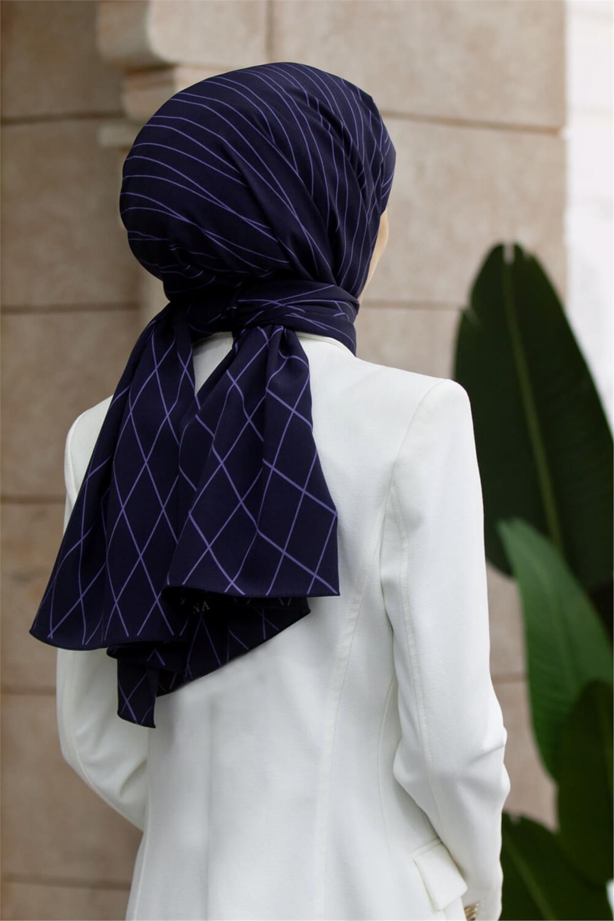 LÜKS MEDİNE İPEĞİ GEOMETRİK DESENLİ LACİVERT - İNDİGO RENKLİ 75X195 KIRIŞMAZ ŞAL MOSS KREP DİKİŞ TİPİ İTALYAN DİKİŞLİ (DGN51256-9)