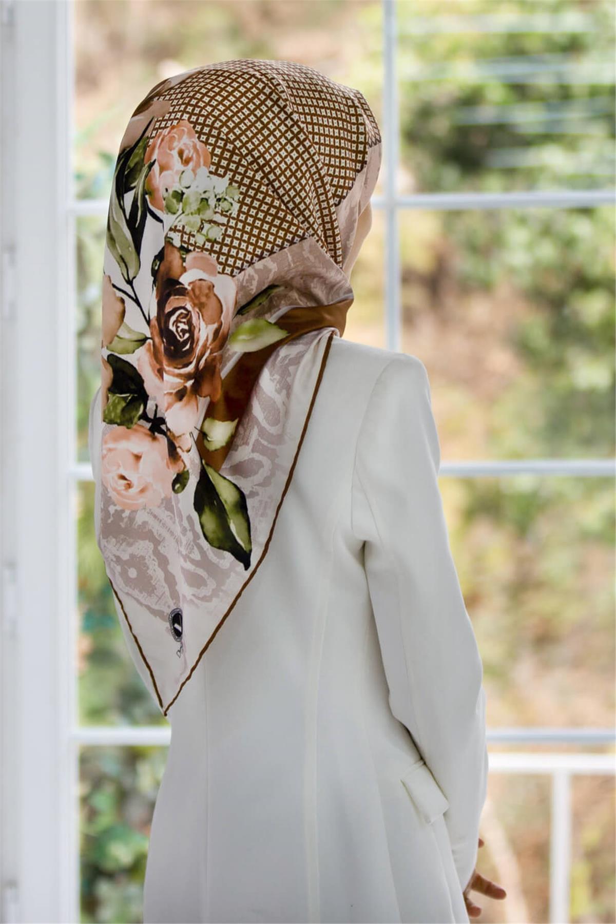 Twill Çiçek Desenli Hardal Renkli 90x90 Eşarp (İpek İçermez) Kenar Dikiş Şekli El Dikişli (DGN51779-1)