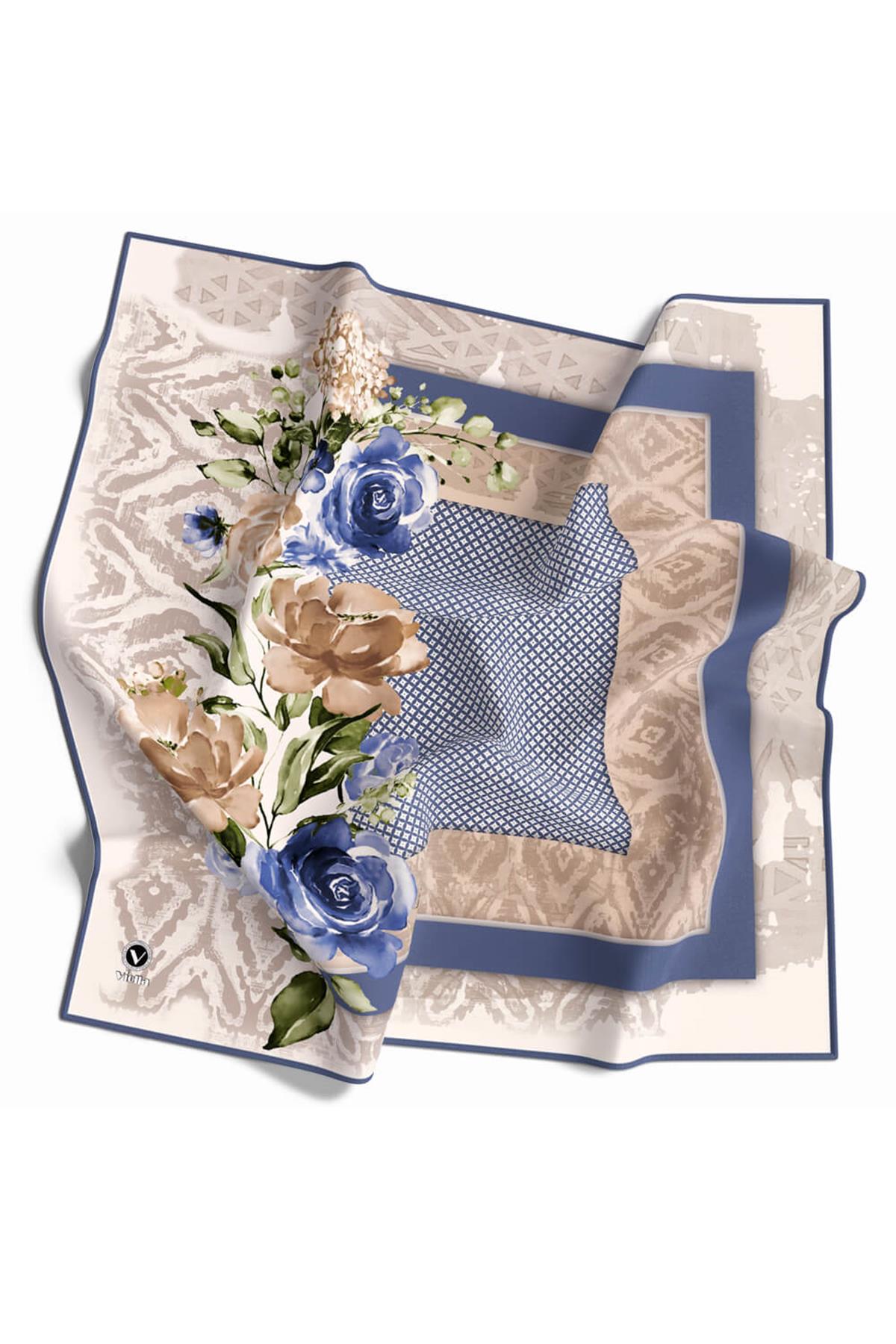 Twill Çiçek Desenli İndigo Renkli 90x90 Eşarp (İpek İçermez) Kenar Dikiş Şekli El Dikişli (DGN51779-7)