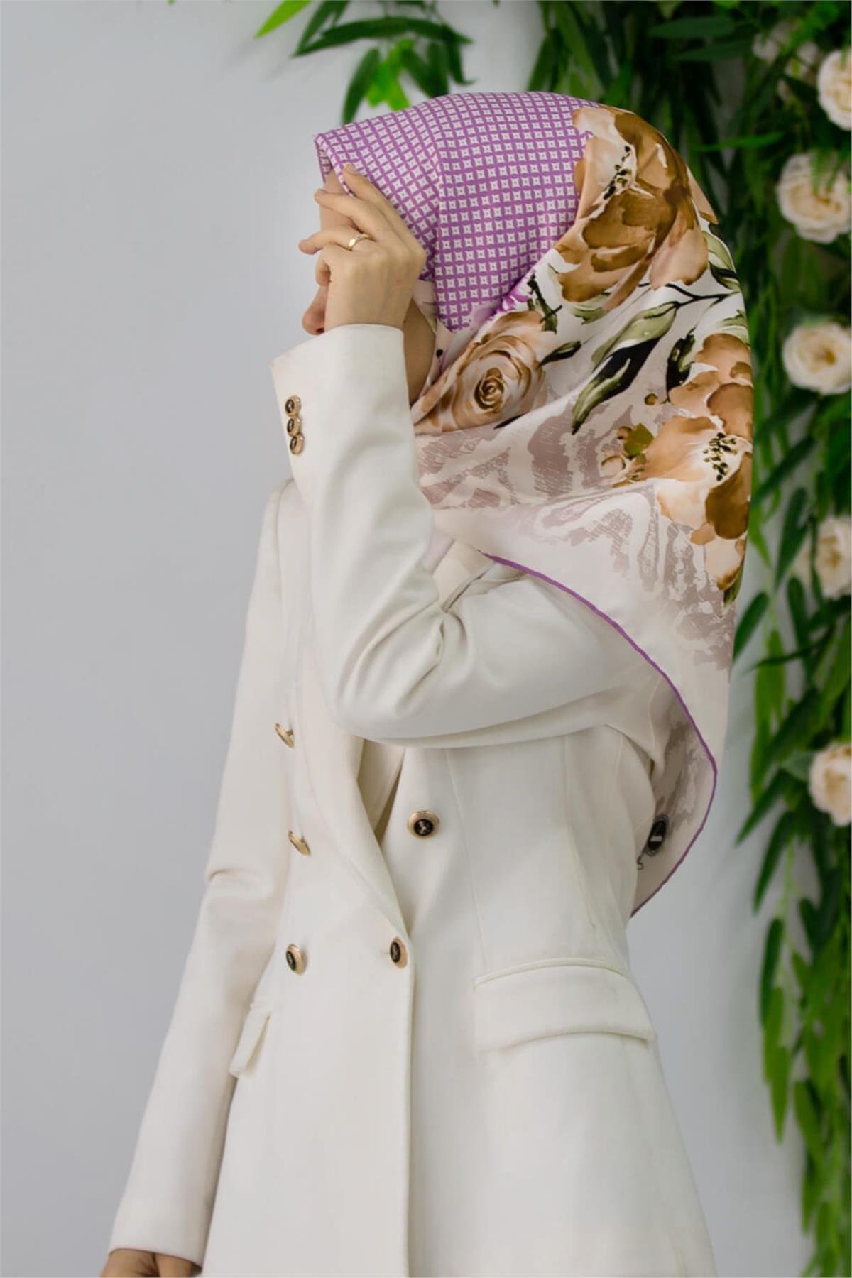 Twill Çiçek Desenli Lila Renkli 90x90 Eşarp (İpek İçermez) Kenar Dikiş Şekli El Dikişli (DGN51779-5)