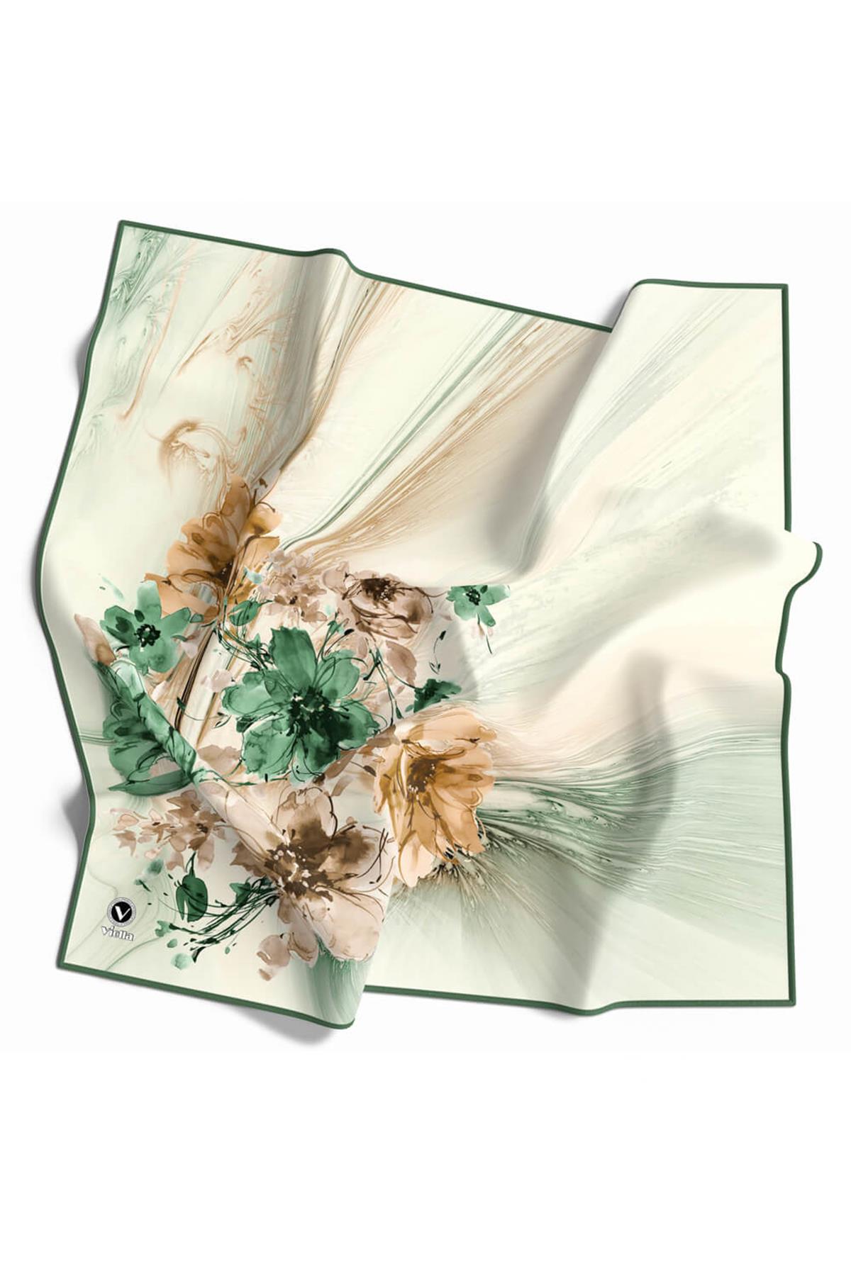 Twill Çiçek Desenli Petrol Yeşili Renkli 90x90 Eşarp (İpek İçermez) Kenar Dikiş Şekli El Dikişli (DGN51792-10)