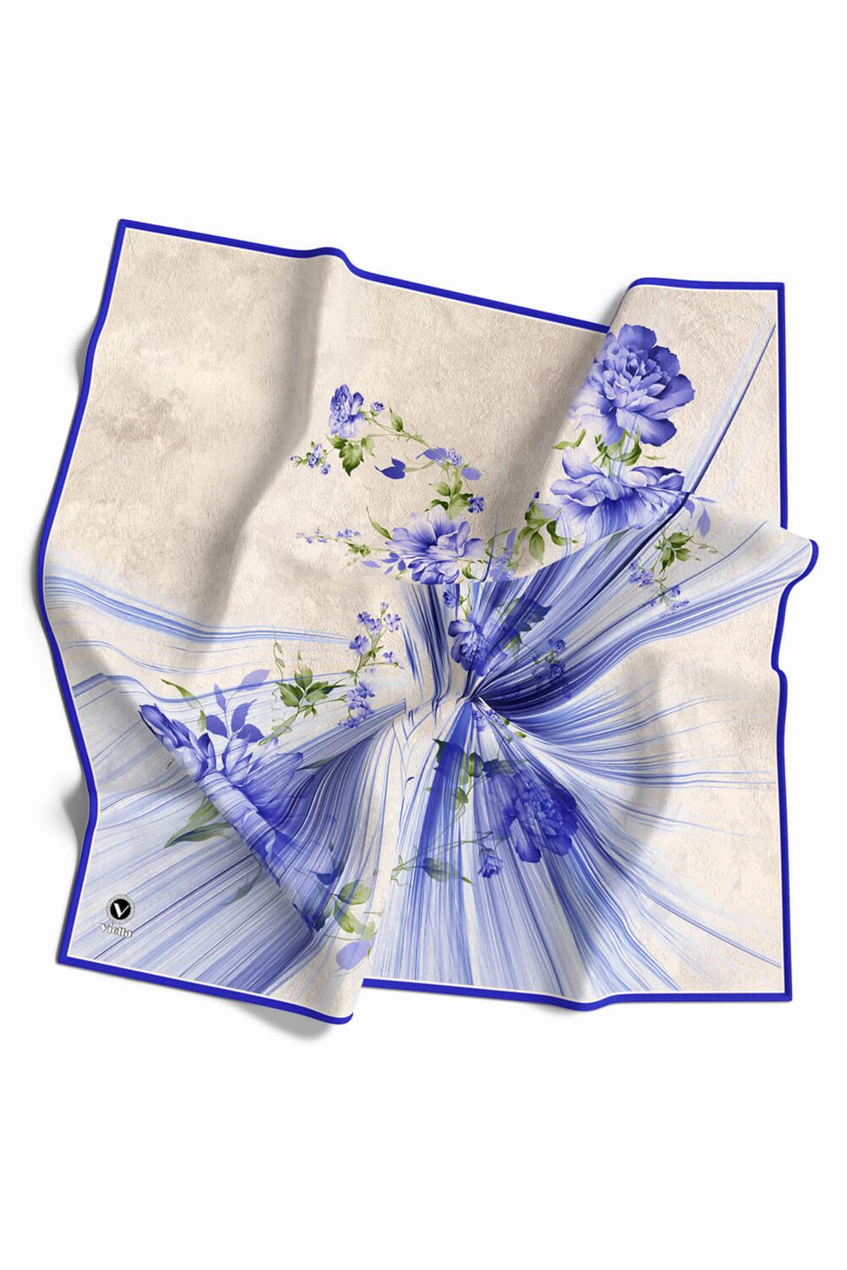Twill Çiçekli Desenli Saks Renkli 90x90 Eşarp (İpek İçermez) Kenar Dikiş Şekli El Dikişli (DGN51765-9)