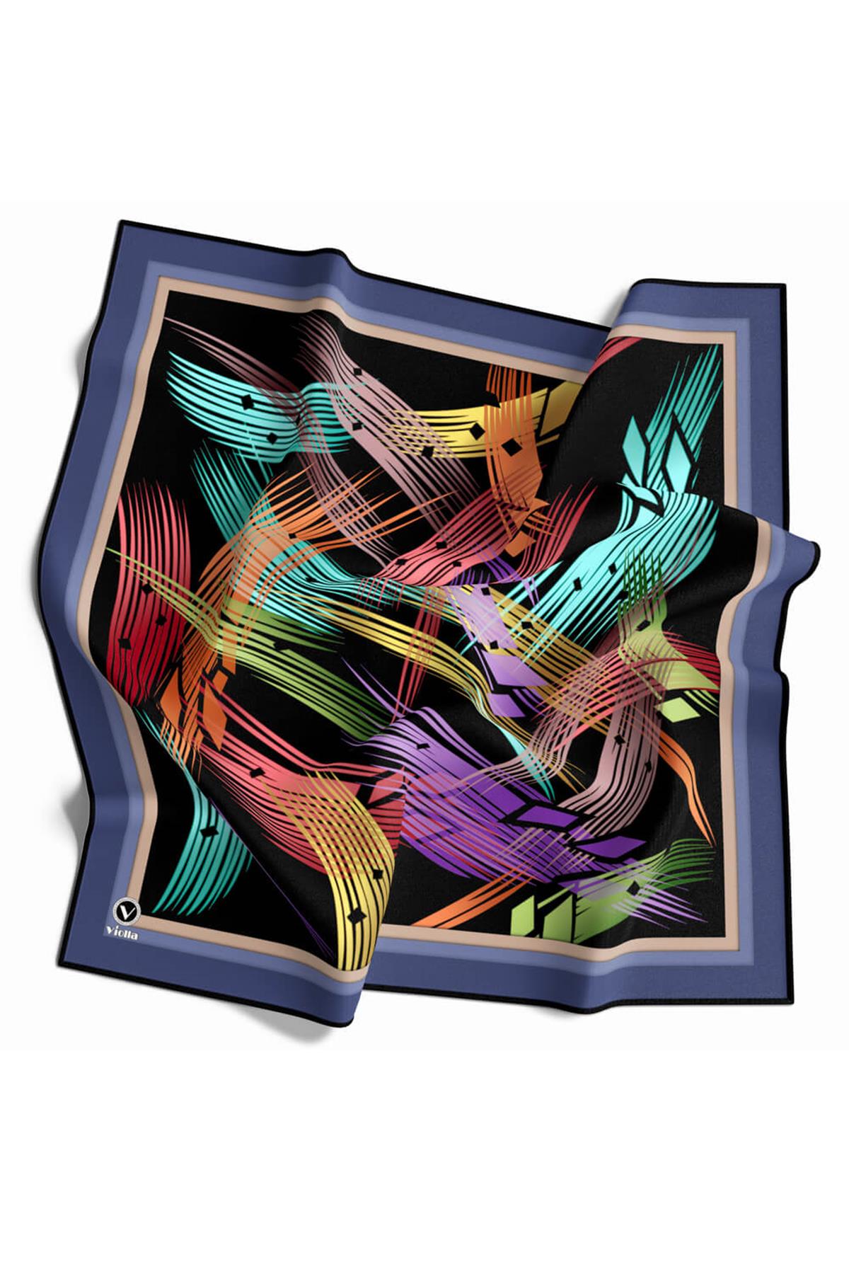Twill Geometrik Desenli İndigo Renkli 90x90 Eşarp (İpek İçermez) Kenar Dikiş Şekli El Dikişli