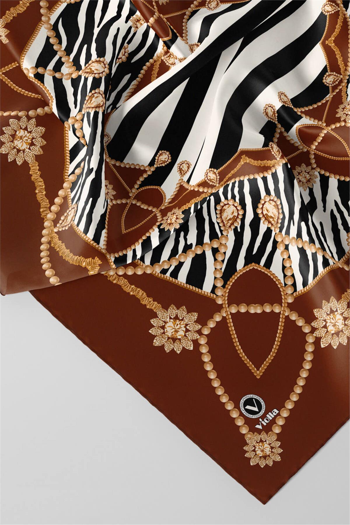 Twill Gold Detaylı Zebra Desenli Taba Renkli 90x90 Eşarp (İpek İçermez) Kenar Dikiş Şekli El Dikişli (DGN51313-3)